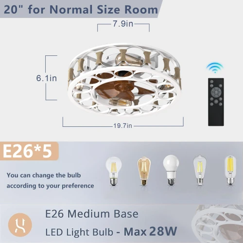 Cage ceiling fan with light remote control, semi-recessed modern ceiling fan, 6 speed reversible blades, 4 LED bulbs included (white)